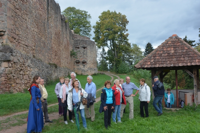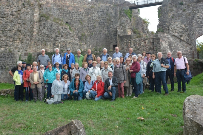 Nach einem leckeren Mittagessen erklommen wir die Hochburg-Hachberg bei Emmendingen, die zweitgrößte Burgruine Badens. Kaum einer von uns hatte von der Existenz dieser Burg vorher schon gewusst. Dort führten uns dann zwei gewandete Damen durch ein Areal voller Geschichte. Passend zu den jeweiligen Örtlichkeiten sangen wir im Bus frohe Lieder; ein schöner Tag, den viele von uns noch in der Weinstube ausklingen ließen. |